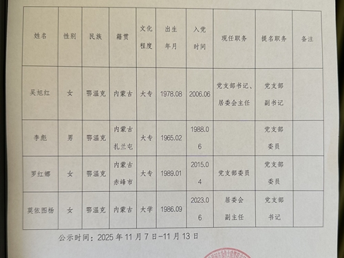 - 2025-11-07中共根河市敖鲁古雅鄂温克族乡社区居民委员会党支部委员会委员…