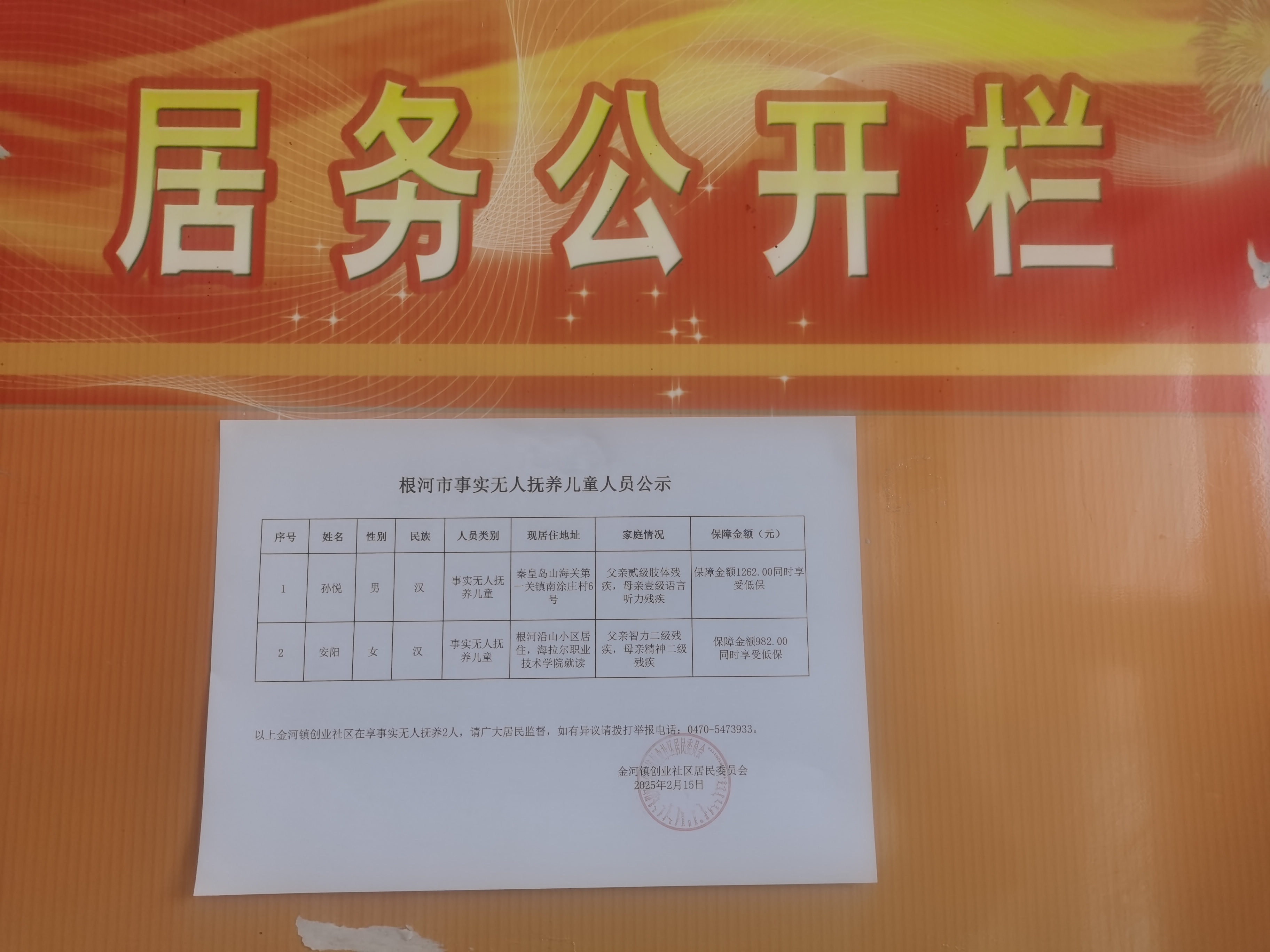 根河市2025年2月事实无人抚养儿童人员公示