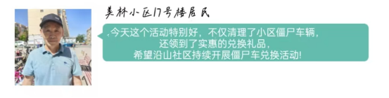 沿山社区书记姜雪莲表示,此次“僵尸车换礼品”活动是社区环境治理的一次成功尝试。下一阶段,沿山社区将开展集中清理行动。对于未做标记的无主车辆,将统一集中放置在小区指定区域,并张贴提醒通知。若多日内无主车辆无人认领,将进行统一清运处理。