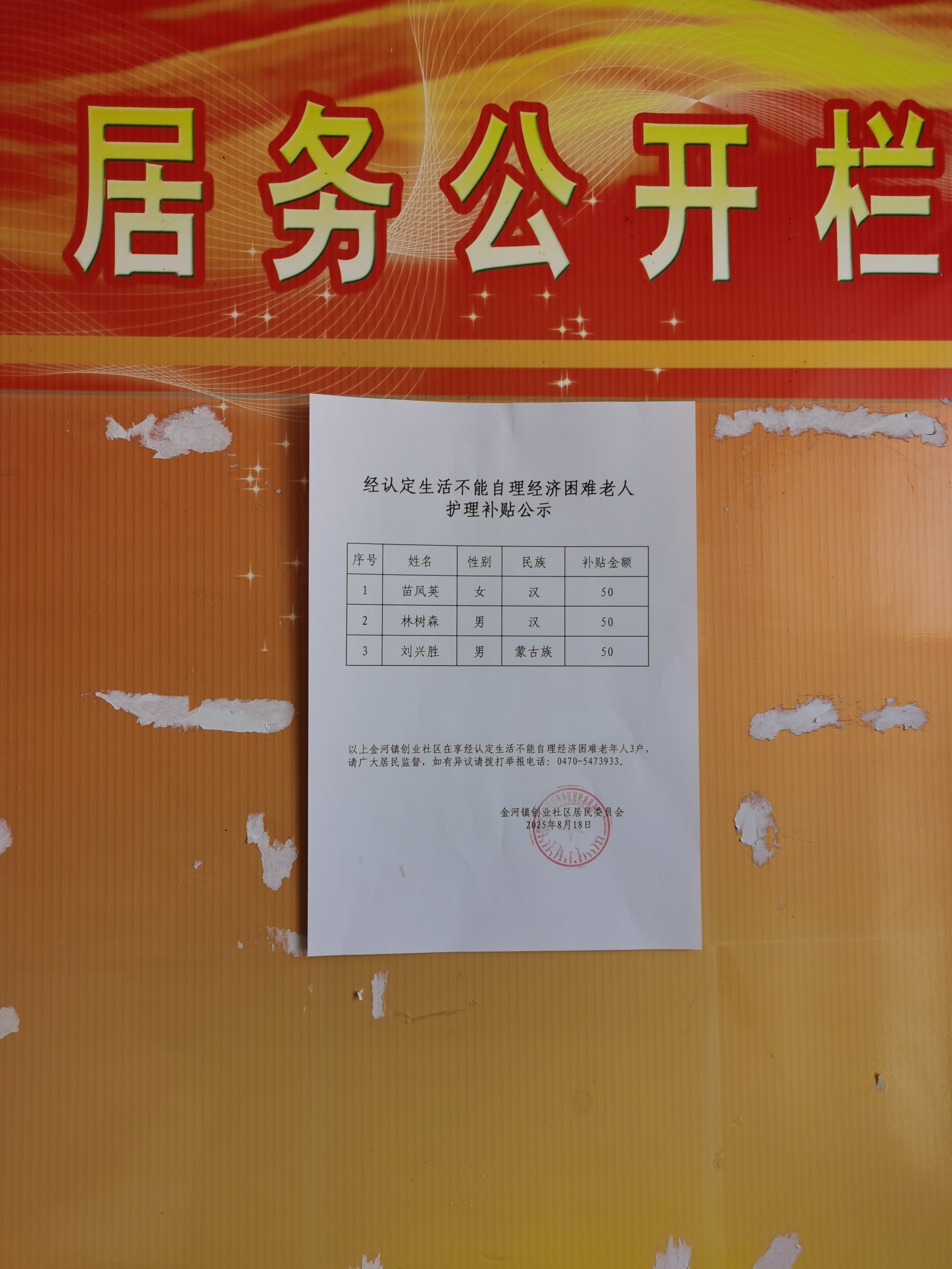 金河镇创业社区2025年8月经认定生活不能自理经济困难老人护理补贴公示
