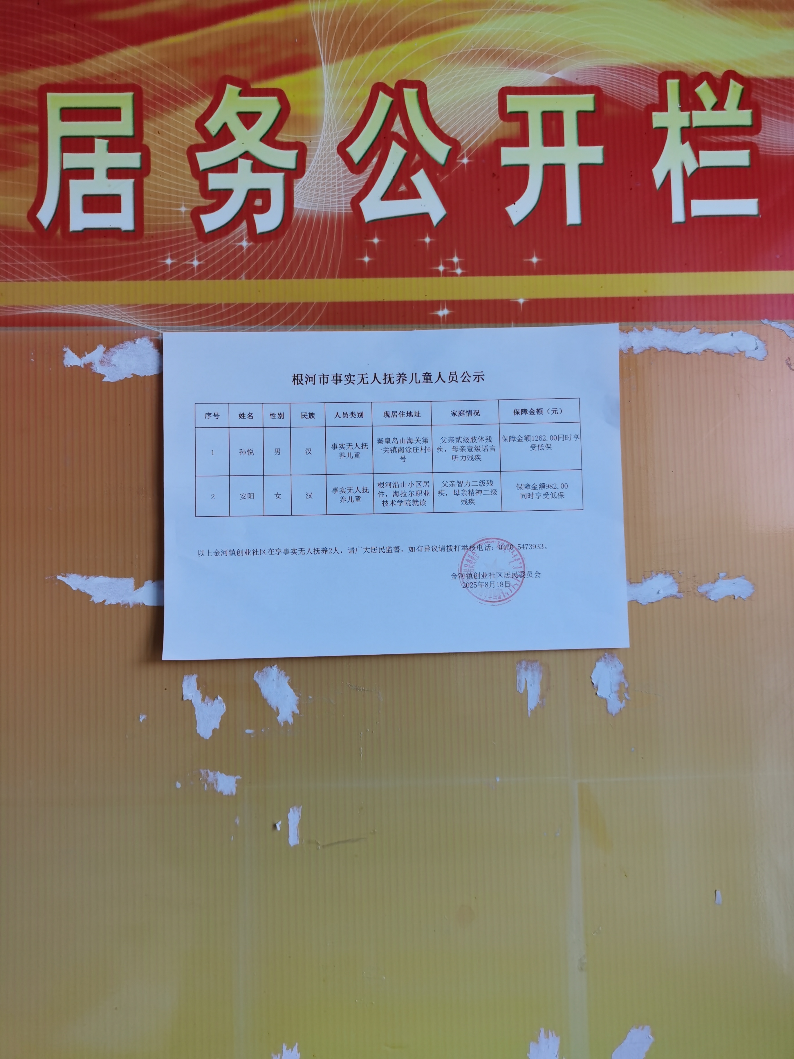 根河市金河镇创业社区2025年8月事实无人抚养儿童人员公示