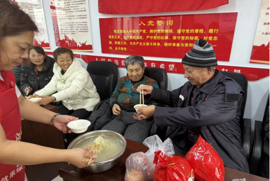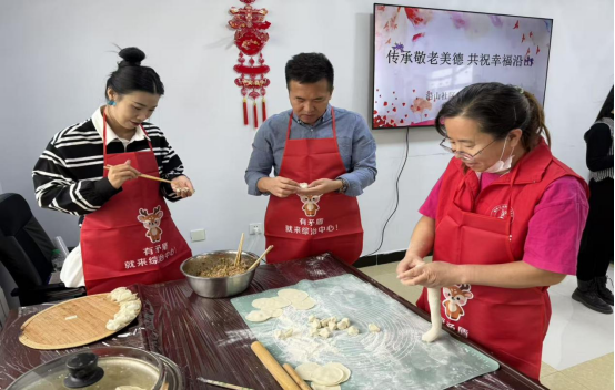 最具烟火气的当属擀面条包饺子环节。社区志愿者与老年居民围坐在一起,揉面、擀皮、包馅,分工协作、默契配合,大家一边动手,一边拉着家常,聊聊生活趣事,说说社区变化,一张张面皮、一个个饺子,包裹着浓浓的邻里情与节日祝福,不一会儿,热气腾腾的长寿面和饺子端上桌,老人们品尝着共同制作的美食,脸上洋溢着幸福的笑容。
