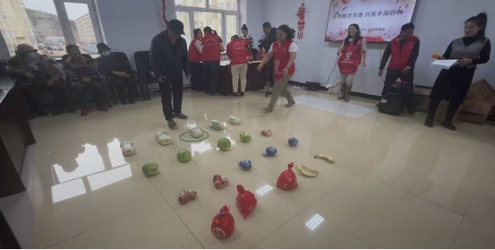 活动最后,套圈游戏点燃全场热情。新鲜的白菜、萝卜、西红柿等蔬菜整齐摆放,老人们手持套圈,瞄准目标、轻轻一抛,套中的居民欢呼雀跃,大家不仅收获了新鲜蔬菜,更收获了满满的快乐与好运。