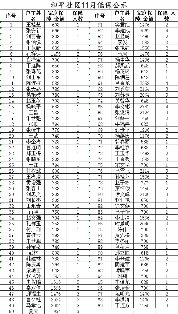 2025年度和平社区11月份低保公示