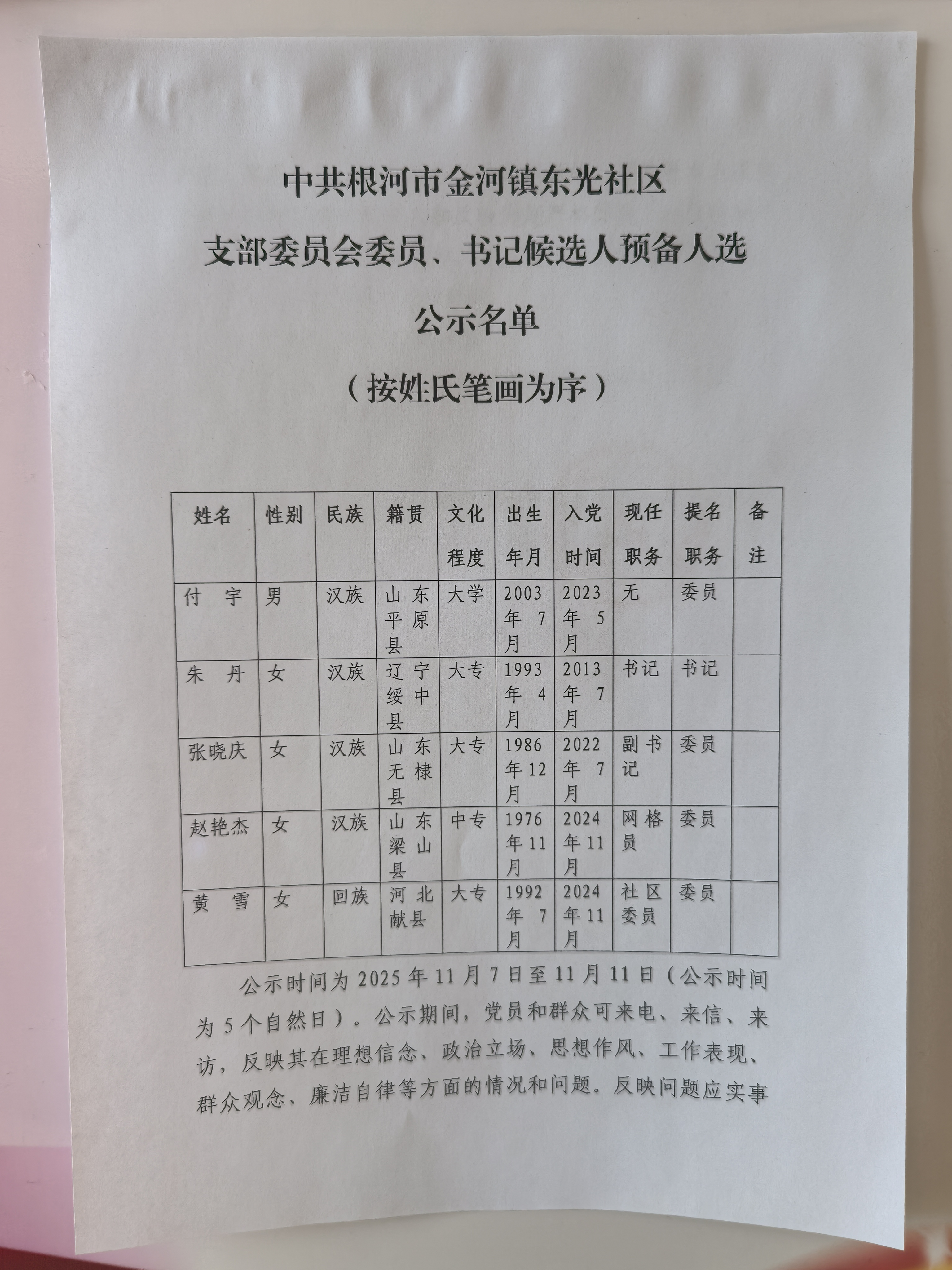 根河市金河镇东光社区支部委员会委员,书记候选人预备人选