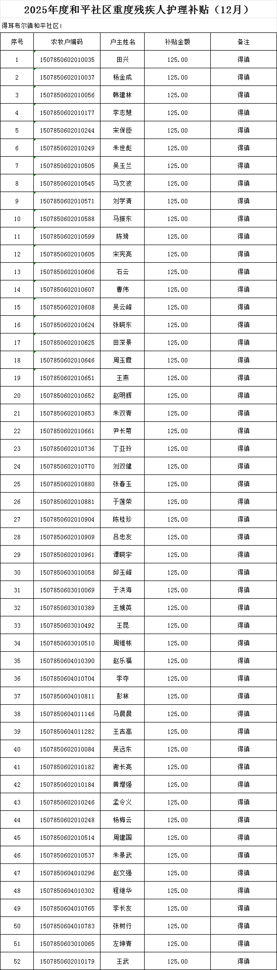 2025年度和平社区重度残疾人补贴(12月份)