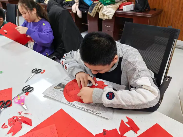 活动室的另一边,剪纸老师给少年儿童们讲述了中国剪纸艺术的发展变化、风格特点、美好寓意,并现场演示了剪纸的基本手法和技巧。随后,少年儿童们开始了紧张而愉快的剪纸之旅,按照老师讲授的剪纸步骤和方法,认真地折叠、细心地剪裁,彼此间相互讨论,互相帮助。