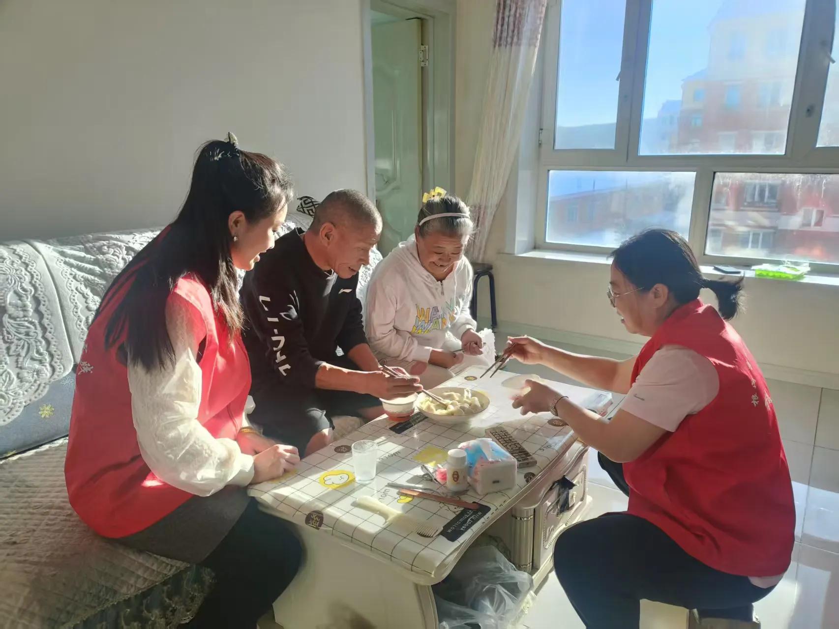 12月5日中午,西爱国街社区新时代文明实践志愿服务队的志愿者们走进独居老人和困难残疾人家中,一边为其包饺子一边聊家常,询问他们的现实身体状况和当前生活需求,帮老人打扫房间。当热气腾腾的饺子端上桌时,彼此脸上洋溢着幸福的笑容。当天志愿者分成两队,分别陪伴2户居民,不仅让特殊群体感受到社区暖暖的关怀,更拉近了大家的距离。