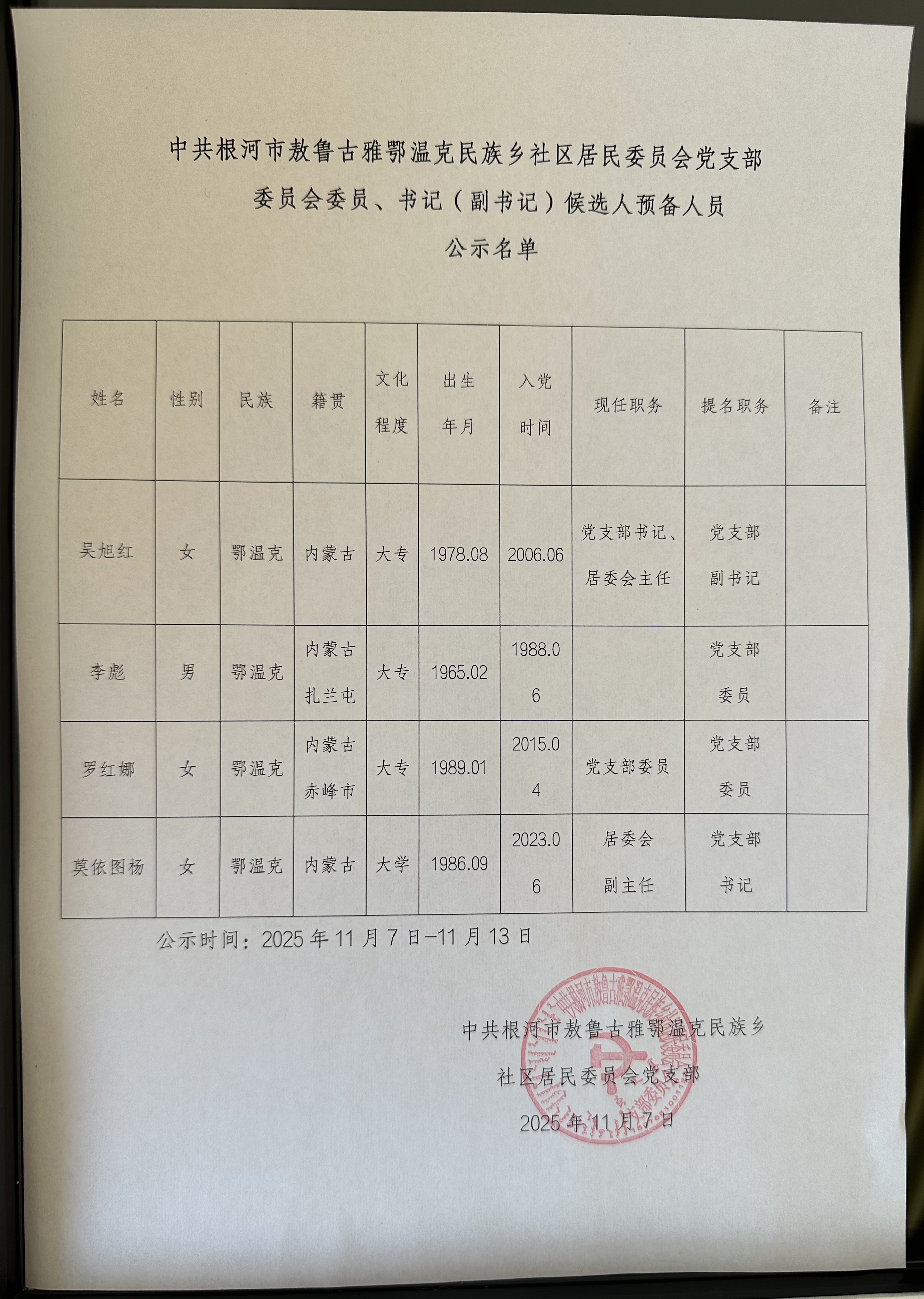 中共根河市敖鲁古雅鄂温克族乡社区居民委员会党支部委员会委员、书记(副书记)候选人预备人员公示名单