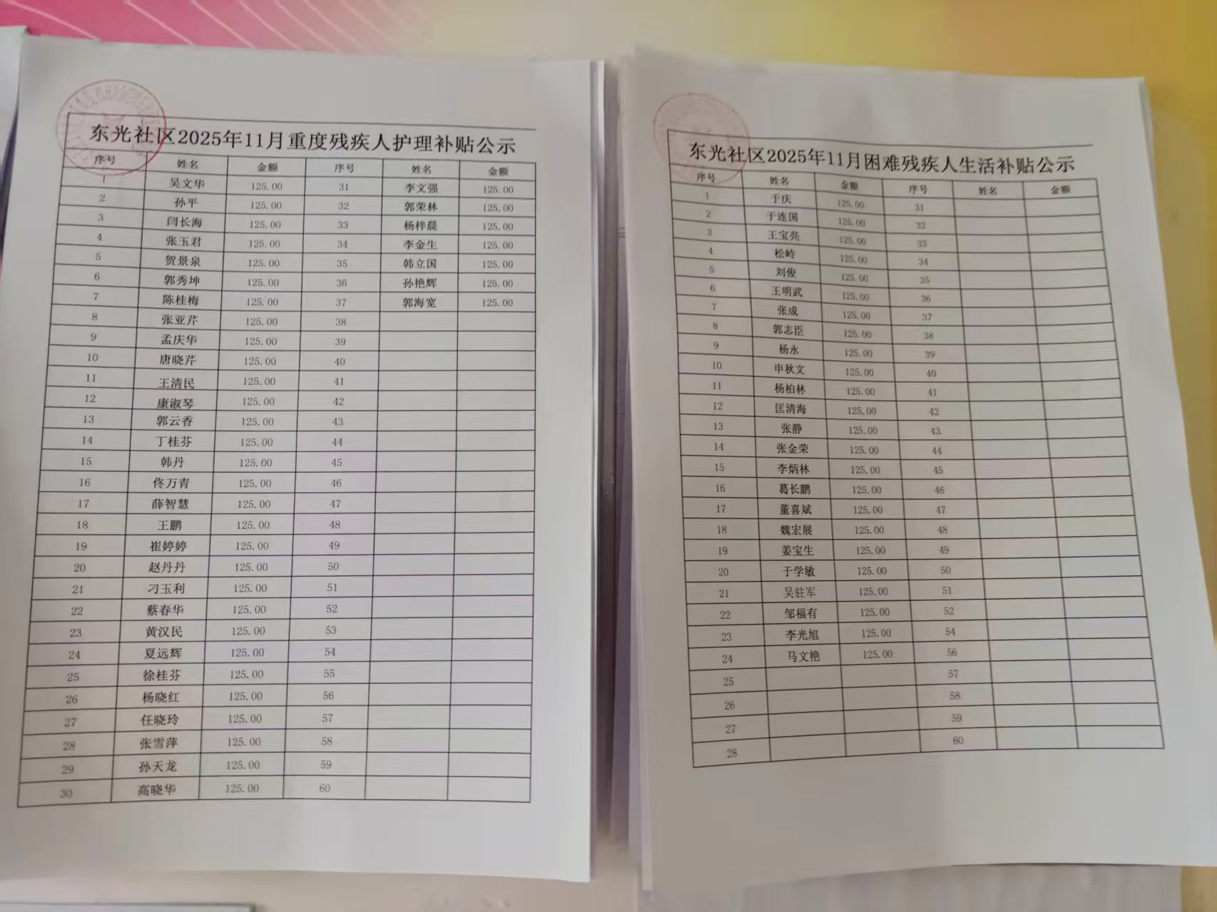东光社区2025年11月重度残疾人补贴及困难残疾补贴公示