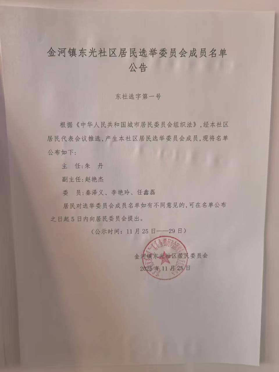 金河镇东光社区居民选举委员会成员名单公示(东社选字 第一号)